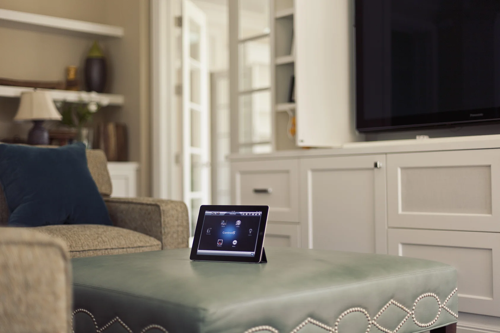 This is a shot of a Control4 remote sitting on a couch in a basement of one of our clients' house in Atherton, CA.